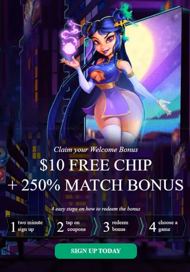 - “$55 Welcome Free Chip” — a no-deposit-style free chip up to $55, with a maximum cashout of $100 and a 40x playthrough requirement. Free chips are useful to try games, but strict cashout caps and high wagering can limit real-value returns.